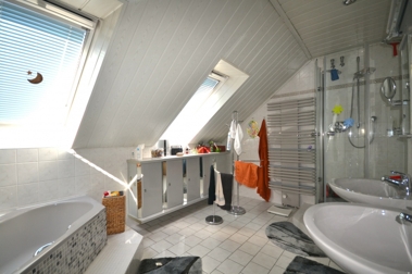 Über eine viertelgewendete Holztreppe gelangen Sie in das Obergeschoss. Dieses verfügt über eine kleine Galerie, von der Sie das großzügige Kinderzimmer mit Balkon, das tagesbelichtete Masterbad mit Badewanne und Dusche, das separate WC, sowie das Schlafzimmer und das Arbeitszimmer betreten können.