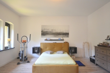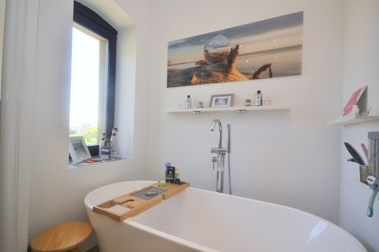 gestattet. Durch eine stilvolle doppelflügelige Holztür betreten Sie das stilvolle Schlafzimmer, dass mit über 25 m² jede Menge Platz für Erholung bietet. Auf der anderen Seite des Wohnzimmers befindet sich ein heller Arbeitsbereich mit angrenzendem Abstellraum, der über drei kleine Stufen problemlos zu begehen ist. Das moderne Tageslichtbad ist sowohl mit einer Dusche, als auch mit einer stilvollen, freistehenden Badewanne ausgestattet und mit Feinsteinzeugfliesen versehen wurden. Gegenüber vom Badezimmer befindet sich eine große Küche mit ausreichend Platz für einen Essbereich und dem Zugang zum traumhaften Balkon. Der Balkon mit Blick ins Grüne ist ca. 15 m² groß und lädt nach einem anstrengenden Tag zum Verweilen ein.