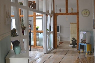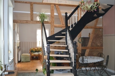 Versetzte Wohnebenen, eine offene Galerie, freigelegtes Fachwerk, Bodenbeläge aus Natursteinen und originalen Eichendielen, Kamine, stilgerechte Einbauküche mit nostalgischem Gasherd – um nur einige der Gegebenheiten zu nennen, die die neuen Bewohner erwarten.