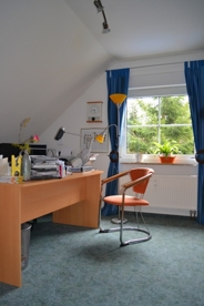 Über die Treppe gelangen Sie von der Galerie aus in das Obergeschoss. Dieses verfügt über drei weitere Zimmer, die gut als Kinder-, Schlaf- oder auch Arbeitszimmer genutzt werden können. Das Badezimmer auf dieser Ebene ist mit einer Eckbadewanne, einer Dusche und zwei Waschtische ausgestattet und verfügt über ein großes Fenster mit Blick ins Grüne.