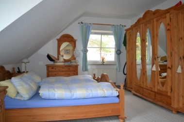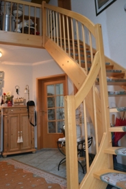 Über eine offene Holztreppe gelangen Sie in das obere Geschoss des Hauses. Diese Etage bietet Ihnen ein helles, geräumiges Schlafzimmer und zwei weitere Zimmer.