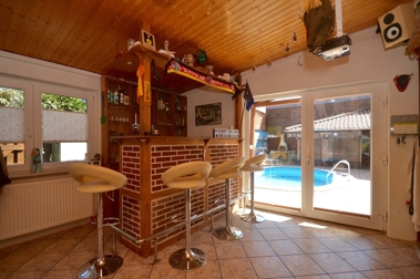 Das Erdgeschoss umfasst drei großzügige Zimmer, die aktuell nicht in Benutzung sind und somit Ihren zukünftigen Wohn- Ess- und Kochbereich darstellen können. Von hier aus könnten Sie unter anderem in einen kleinen Gartenbereich gelangen. Aktuell befindet sich dieser Zugang in dem "Freizeitbereich", der durch einen ca. 30m² großem Raum geschaffen wird. Ausgestattet mit einem kleinen Barbereich und dem Ausblick auf den herrlichen Pool schaffen Sie so den idealen Ort um gemütliche Abende mit Freunden oder der Familie zu verbringen.