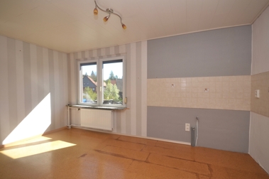 Im Obergeschoss des Hauses präsentieren sich das große und lichtdurchflutete Wohnzimmer, sowie die helle und freundliche Küche.