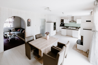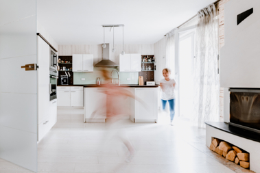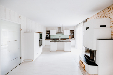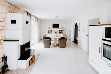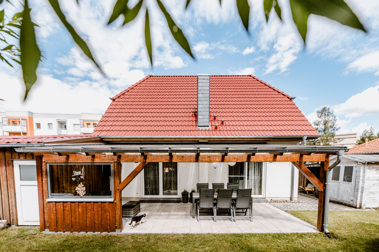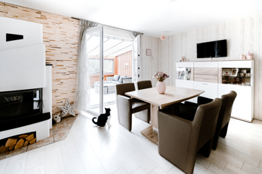 Neben dem großen Wohn- und Essbereich, mit integrierter Einbauküche befinden sich hier noch ein tagesbelichtetes Gäste-WC und ein praktischer Hauswirtschaftsraum. Das Wohnzimmer mit direktem Zugang in den sonnigen Garten und auf die gemütliche Terrasse bildet gemeinsam mit dem hochwertigem Koch- und Essbereich das Herzstück der Immobilie und sorgt für viele gemeinsame Stunden mit der Familie. Für eine gemütliche Atmosphäre sorgt darüber hinaus der Kaminofen, der auch in den kühleren Monaten zum wohlfühlen einlädt.