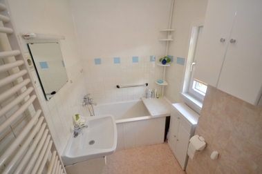Über die originale Echtholztreppe gelangen Sie in das komfortable Obergeschoss des Wohnhauses. Ihnen stehen hier neben einem tagesbelichtetem Bad, ausgestattet mit einer Badewanne, außerdem eine gemütliche Küche mit angrenzendem Vorratsraum und vier großzügige und helle Wohn- und Schlafräume bereit.