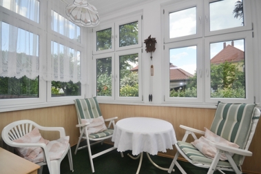 Die am Wohnzimmer angrenzende Veranda schafft eine direkte Verbindung zwischen dem imposanten Wohnbereich und dem gemütlichen sowie gepflegtem Garten und bildet den idealen Ort zum Verweilen.