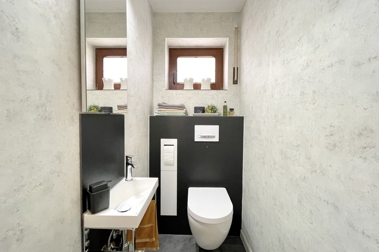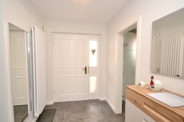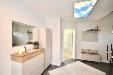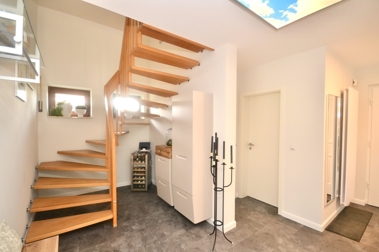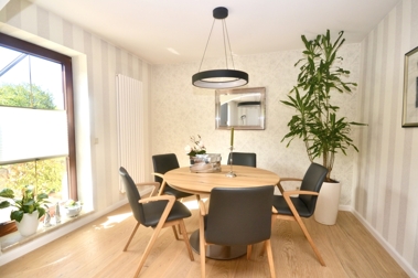 Ein besonderes Highlight dieser Immobilie ist der wunderschöne Wintergarten, der das ganze Jahr über einen traumhaften Blick auf die umliegende Natur ermöglicht und als perfekter Ort für Entspannung und Erholung dient. Zusätzlich schafft er die komfortable Verbindung zwischen der exklusiven Küche und dem lichtdurchfluteten Wohn- und Essbereich. Ergänzt werden die Räumlichkeiten im Erdgeschoss von einem ebenfalls 2022 modernisierten Gäste-WC und einem praktischen Hauswirtschafts- und Abstellraum, in dem sich die 2021 neu installierte Gastherme befindet.
