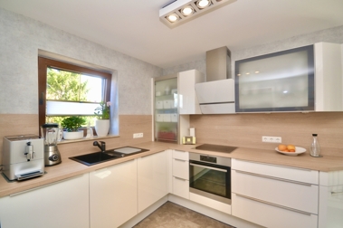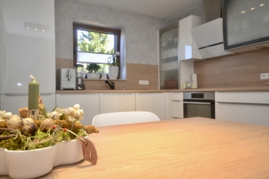 Bereits beim Betreten des Hauses wird man von einer geräumigen Diele empfangen, welche den Zugang in die verschiedenen Räumlichkeiten des stilvoll gestalteten Erdgeschosses ermöglicht. Das helle und großzügige Wohnzimmer, mit seinem integrierten Essbereich, eignet sich ideal für gesellige Zusammenkünfte mit Familie oder Freunden und verschafft Ihnen zusätzlich den Zugang auf die sonnige Terrasse und in den idyllischen Garten. Die modern und ästhetisch gestaltete Küche ist darüber hinaus mit hochwertigen Geräten ausgestattet und bildet das Zentrum für Genuss und Kulinarik.