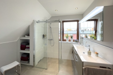 Über eine schöne Holztreppe betreten Sie das ausgedehnte Dachgeschoss, welches drei gemütliche Schlafzimmer beherbergt, die einen erholsamen Schlaf ermöglichen. Selbstverständlich können die Räume individuell an Ihre Wohnwünsche angepasst werden und somit auch als Kinder-/Gästezimmer oder als Arbeitszimmer zur Verfügung stehen. Das vollständig renovierte und stilvolle Duschbad erhöht zusätzlich den Wohnkomfort.