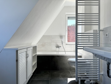 Die Wohnung erstreckt sich über zwei Ebenen. In der unteren Ebene finden Sie den offenen und lichtdurchfluteten Koch- und Essbereich, das angrenzende Wohnzimmer sowie ein komfortables Schlafzimmer. Das tagesbelichtete Wannen- und Duschbad wurde ebenfalls saniert und besticht durch die harmonische Kombination aus dunklen und hellen Fliesen, die ihm einen eleganten Look verleihen und es zu einem echten Highlight machen.