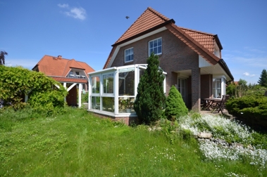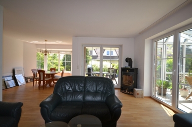Das Haus verfügt über 4 Zimmer verteilt auf ca. 130 m² Wohnfläche und zusätzlichem Dachboden. Im Erdgeschoss des Hauses gelangen Sie von der lichtdurchfluteten Diele aus in das großzügige Wohn- und Esszimmer mit Kamin und Wintergarten, welches durch seine Fensterfronten mit den bodentiefen Fenstern besonders hell und freundlich erscheint. Von hier aus haben Sie einen Blick in den Garten und Zugang zur großen Terrasse. Weiterhin befinden sich im Erdgeschoss die Küche mit Einbauküche, der Hauswirtschaftsraum sowie das Gäste-WC.