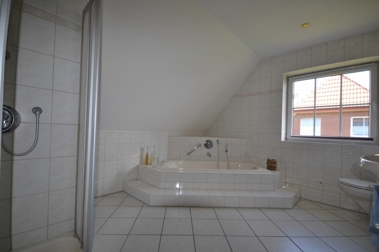 Über die massive Holztreppe gelangen Sie von der Diele aus in das Obergeschoss. Dieses verfügt über drei weitere Zimmer, die gut als Kinder-, Schlaf- oder auch Arbeitszimmer genutzt werden können. Das Badezimmer auf dieser Ebene ist mit einer Eckbadewanne, einer Dusche und zwei Waschtische ausgestattet und verfügt über ein großes Fenster mit Blick ins Grüne.