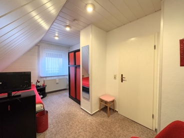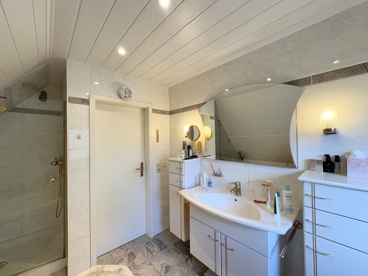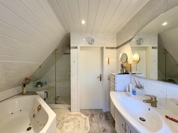 Im ausgebauten Dachgeschoss befinden sich zwei Schlafzimmer sowie das tagesbelichtete Hauptbad mit Dusche und Badewanne. Das vollunterkellerte Haus bietet zusätzlichen Platz mit verschiedenen Abstell- und Lagerräumen. Ein wohnwirtschaftlich nutzbares Zimmer und eine funktionale Waschküche mit weiterem WC und einer Dusche runden das Raumangebot ab.