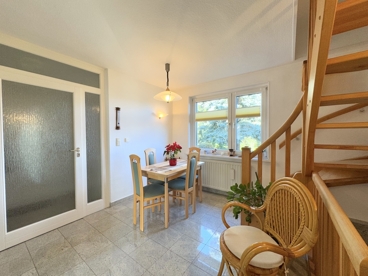 Das Erdgeschoss empfängt seine Bewohner mit einer angenehmen Wohnatmosphäre. Eine einladende Küche mit angrenzendem Essbereich geht in das freundliche und helle Wohnzimmer über, das mit einem Kaminofen ausgestattet ist und insbesondere in den Wintermonaten für wohlige Wärme sorgt. Zusätzlich stehen ein Gäste- oder Arbeitszimmer sowie ein praktisches Gäste-WC zur Verfügung.