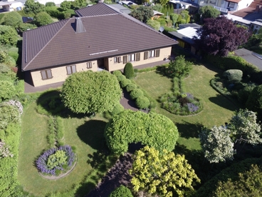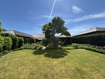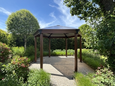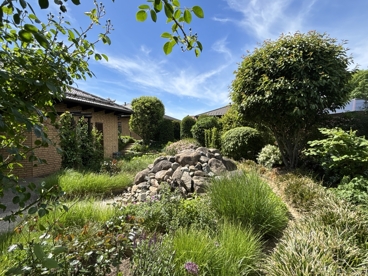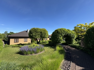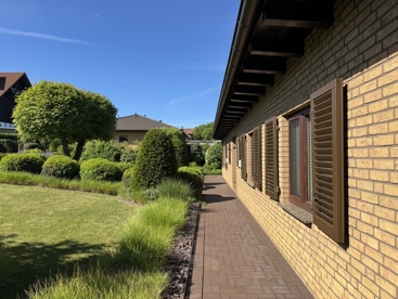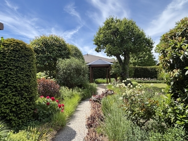 Die großflächige, patioartige Terrasse ist mit elektrischen Markisen überdacht und bietet eine geschützte Lounge-Zone mit direktem Blick in den liebevoll angelegten Garten. Dieser beeindruckt durch hochwertiges Pflaster, einen stilvollen Pavillon sowie sorgfältig ausgewählte Bepflanzung – eine grüne Oase, die zu jeder Jahreszeit ihren Reiz entfaltet.