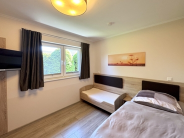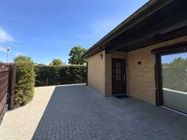 Der helle Wohn-, Ess- und Kochbereich mit Zugang zur weitläufigen Terrasse bildet das Zentrum des Hauses und ist offen, freundlich und modern gestaltet. Ein größeres sowie ein kleineres Schlafzimmer bieten individuellen Nutzungsspielraum, sei es für Gäste, Büro oder Ruhezone.