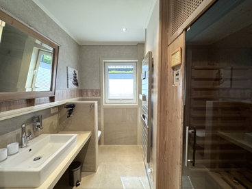 Das geräumige Badezimmer ist mit einer Infrarotkabine ausgestattet – ein besonderes Wellness-Extra, das Körper und Geist wohltut. Zusätzlich steht ein zweites Duschbad mit WC für Gäste zur Verfügung. Ein weiteres Highlight ist der großzügige Hauswirtschafts- und Hausanschlussraum, der praktischerweise direkt von der Einfahrt aus zugänglich ist – ideal als Lagerfläche. Diese wird durch den großflächigen Dachboden sogar noch erweitert, sodass jederzeit ausreichend Abstellmöglichkeiten vorhanden sind.
