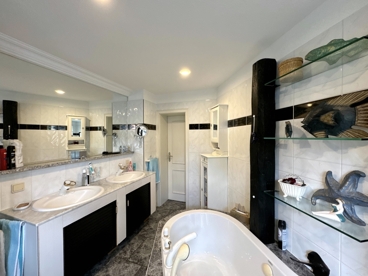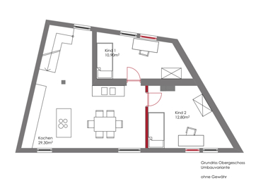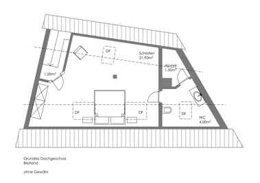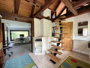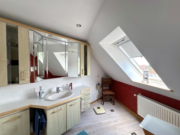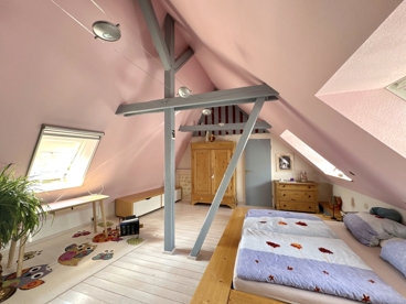 Das Dachgeschoss schließlich ist ein echtes Highlight: Ein traumhaft schöner Schlafbereich mit sichtbarem Fachwerk und großen Dachfenstern, die für reichlich Licht und ein ganz besonderes Raumgefühl sorgen. Eine kleine Ankleide und ein weiteres Sanitärbereich mit Waschbecken und WC machen diese Ebene zum idealen Rückzugsort – ein Elternbereich, wie man ihn sich wünscht: gemütlich, lichtdurchflutet und mit viel Atmosphäre.