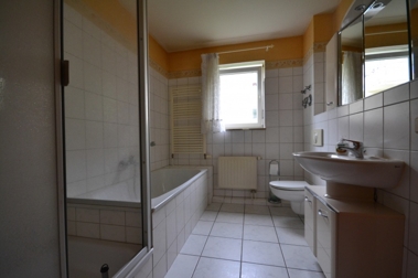 Das hell geflieste Bad verfügt über eine Badewanne und eine Dusche.
