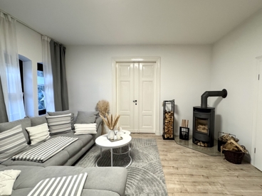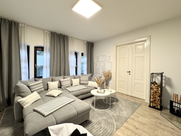 Von hier aus können Sie das Wohnzimmer, sowie die Küche und das Badezimmer direkt betreten. Das repräsentative Wohnzimmer besticht ebenso wie die gesamte Wohnung durch villenypische, 3m hohe Decken, sowie durch den neuen Laminatfußboden und verfügt über einen Zugang zum Schafzimmer und zum Arbeitszimmer. Des Weiteren wurde dieser traumhafte Raum mit einem modernen Kamin, der gerade in den kalten Monaten eine angenehme, warme Atmosphäre schafft, aus-