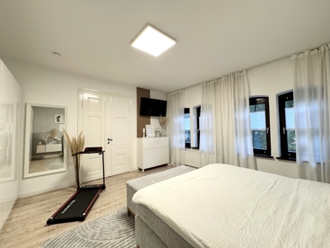 gestattet. Durch eine stilvolle doppelflügelige Holztür betreten Sie das stilvolle Schlafzimmer, dass mit über 25 m² jede Menge Platz für Erholung bietet. Auf der anderen Seite des Wohnzimmers befindet sich ein heller Arbeitsbereich mit angrenzendem Abstellraum, der über drei kleine Stufen problemlos zu begehen ist. Das moderne Tageslichtbad ist sowohl mit einer Dusche, als auch mit einer stilvollen, freistehenden Badewanne ausgestattet und mit Feinsteinzeugfliesen versehen wurden. Gegenüber vom Badezimmer befindet sich eine große Küche mit ausreichend Platz für einen Essbereich und dem Zugang zum traumhaften Balkon. Der Balkon mit Blick ins Grüne ist ca. 15 m² groß und lädt nach einem anstrengenden Tag zum Verweilen ein.